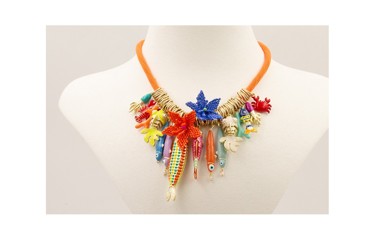 Collar goma naranja con arandelas doradas mate, peces, calamares, cangrejos todos esmaltados con flores miyuki naranja y azulona.