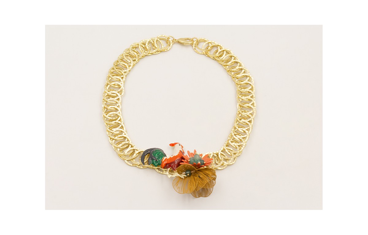 Collar completo aros dorado mate con gallina esmaltada, flor esmaltada naranja con cubos azul grisaceos, petalos esmaltado mostaza.