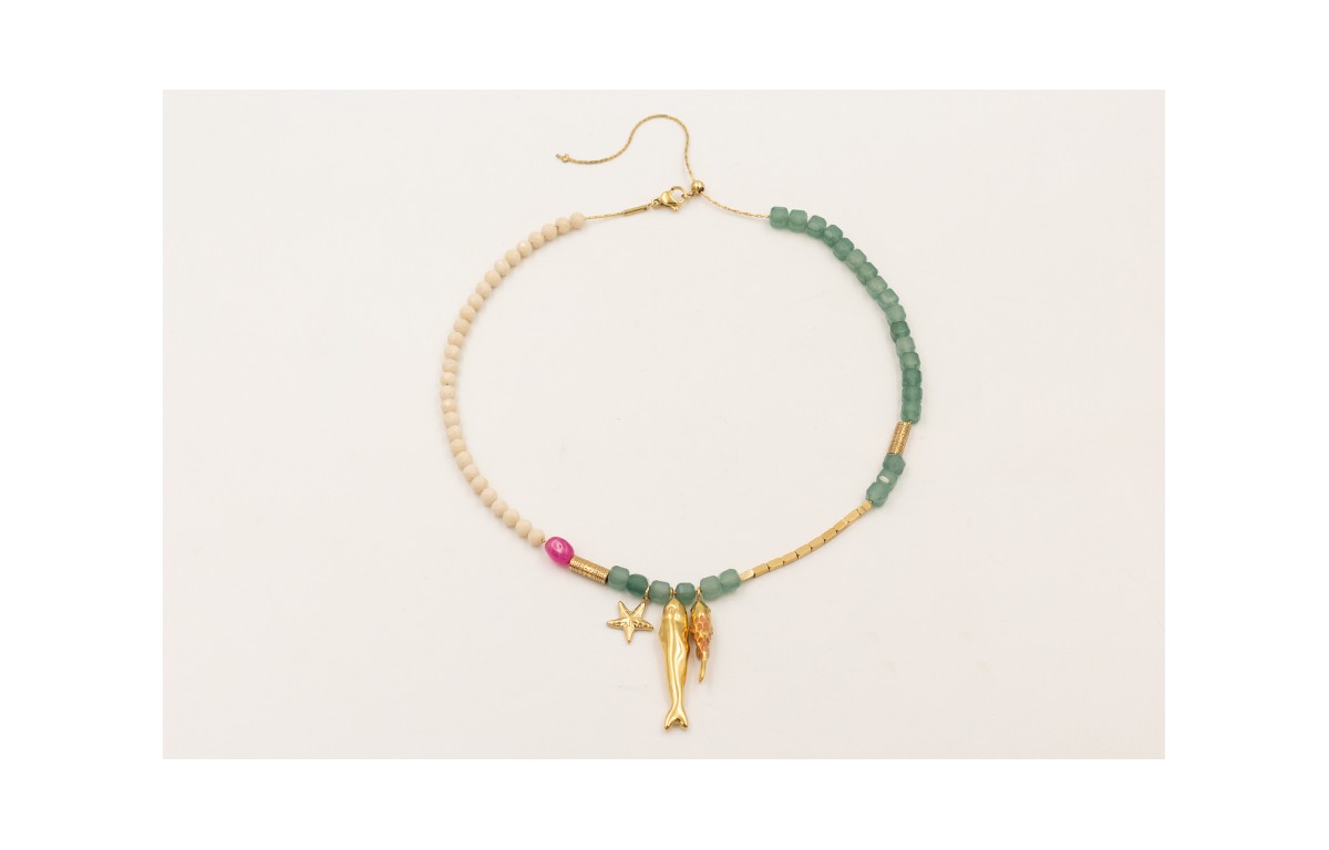 Collar completo ACERO INOXIDABLE extensible con bola facetadas beige, cubos biselados gris azulado, pepita jade granate, colgantes peces y estrella de mar.