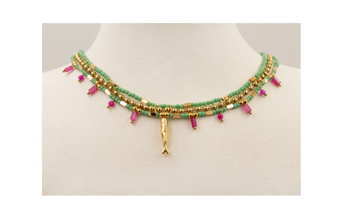 Collar 3 vueltas ACERO INOXIDABLE de cadena caompleta regulable con bolitas piedra verde opaco, listones jade granate, pez y entrepiezas.