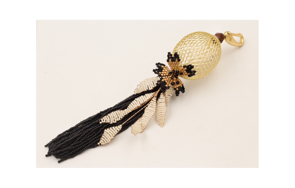 Llavero fleco abalorio negro con rama miyuki beige y flor miyuki negra y cobre, pieza rejilla ovalada.