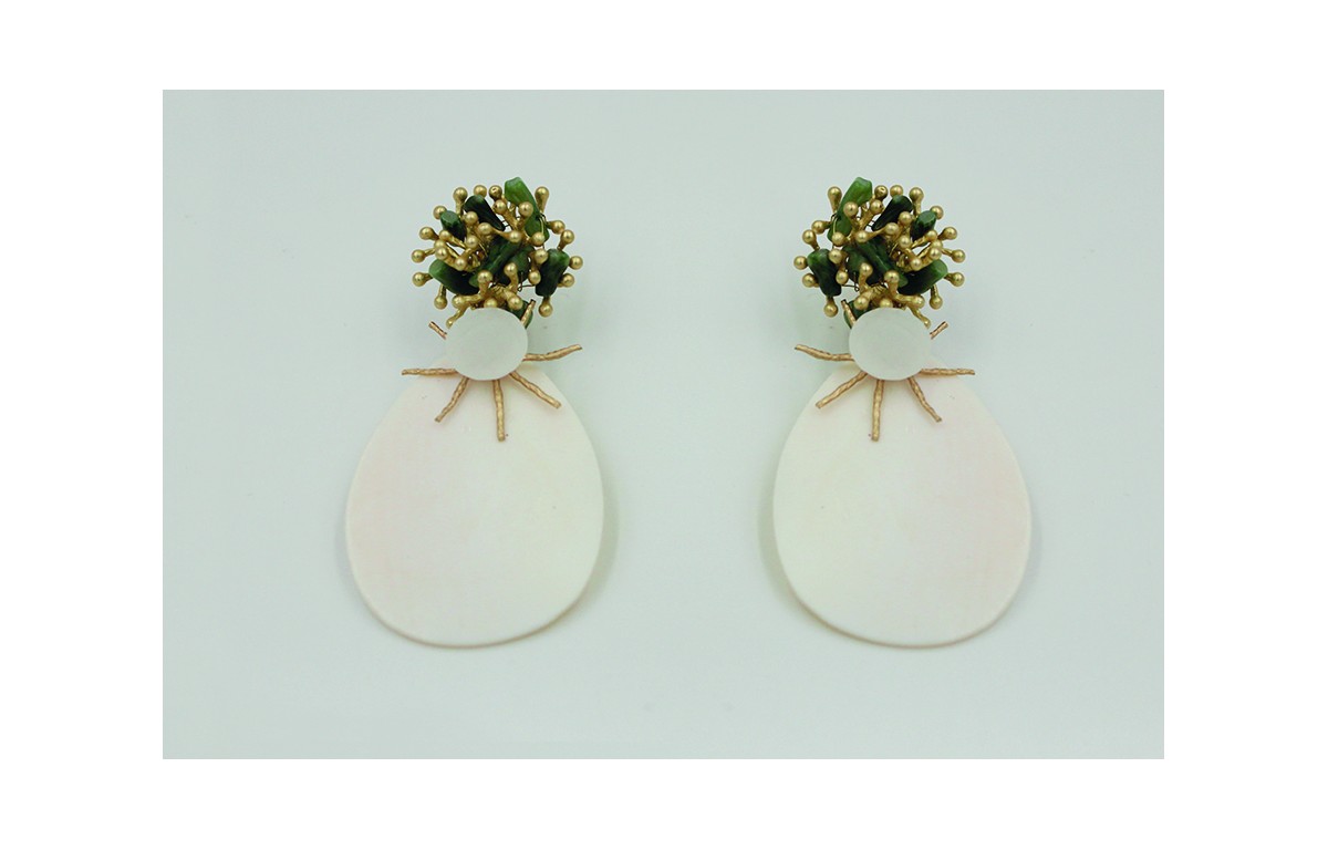 Pendientes perno coral oro mate y piezas de coral verde con colgante gota de nacar y cristal blanco opal