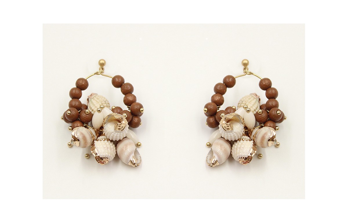 Pendientes aro con bolas de madera, corales blancos y caracolas borde dorado colgando.