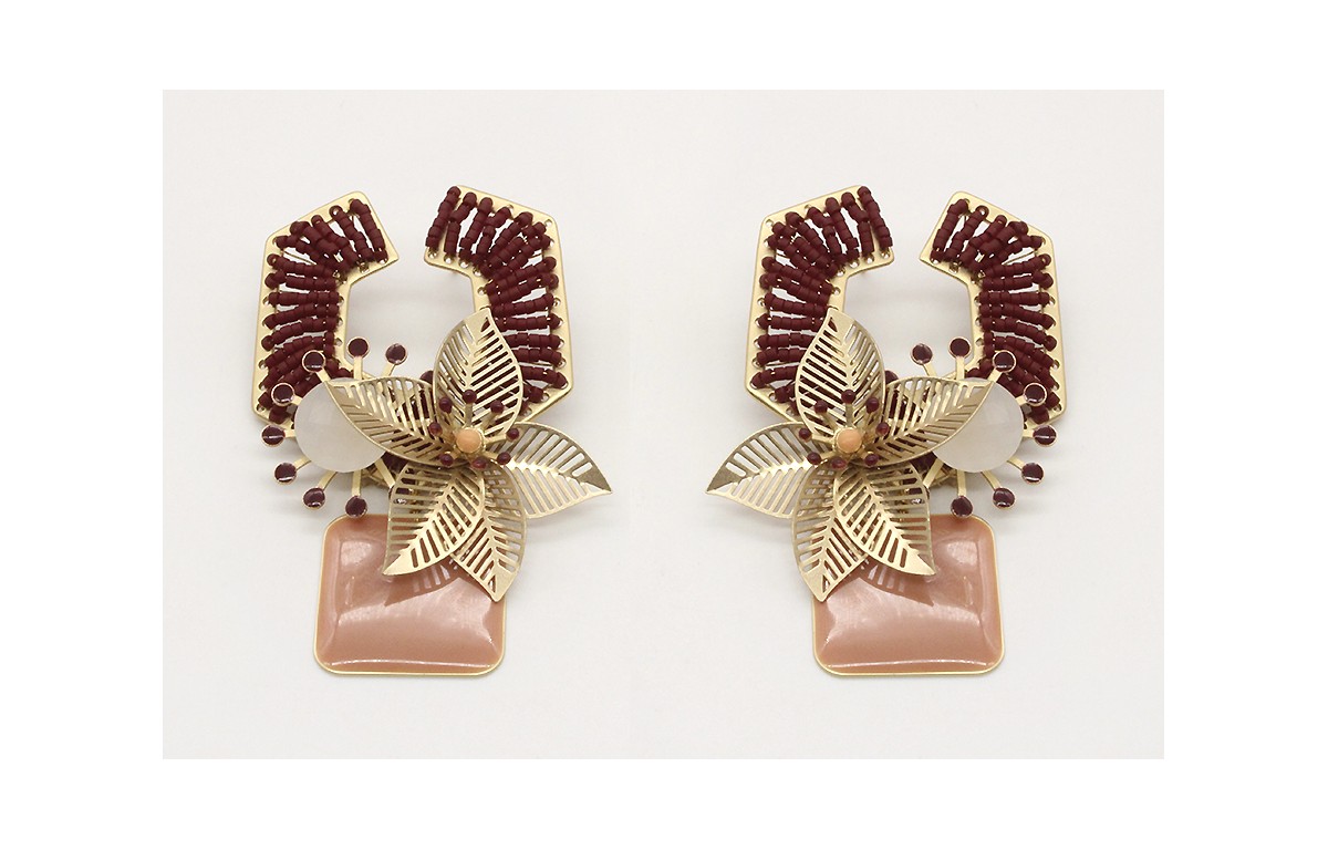 Pendientes miyuki granate con brillo blanco opal, flor de hoja rallada, cuadrado esmaltado rosa. Largo 7cm