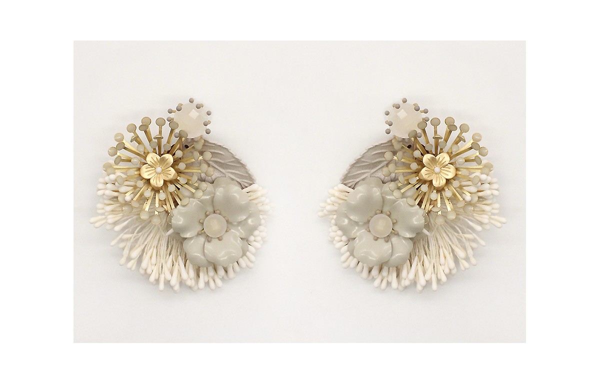Pendientes con estambres blancos, casquillas y flor esmaltadas en gris.
