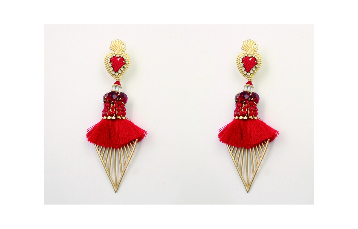 Pendientes perno sagrado corazón con corazón miyuki rojo y strass cristal mate y colgante pompones rojos, triangulo oro mate, strass granates. Largo 11cm.