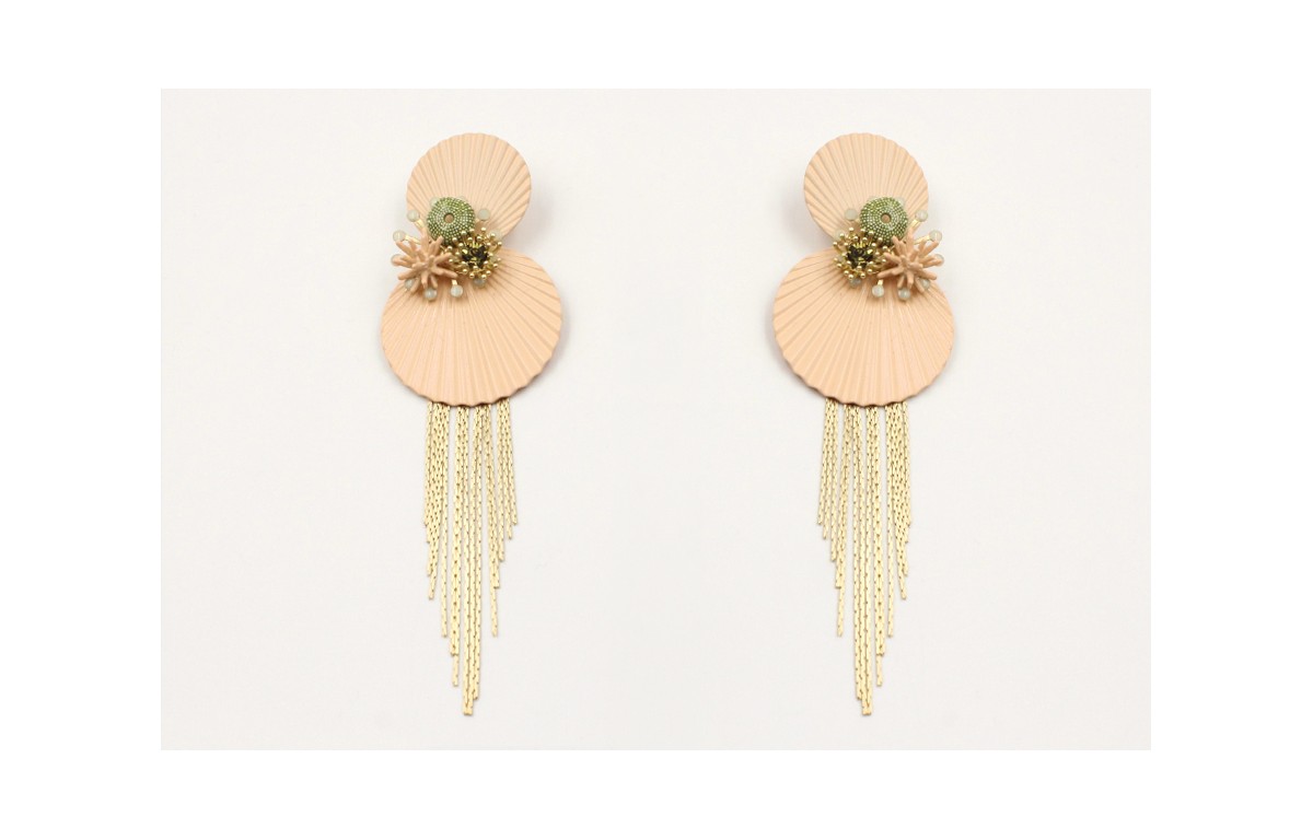 Pendientes discos ondulados salmón con fleco oro mate, caracol mar verde,estrellla coral esmaltada salmón y casquilla con brillo verde. Largo 13cm.