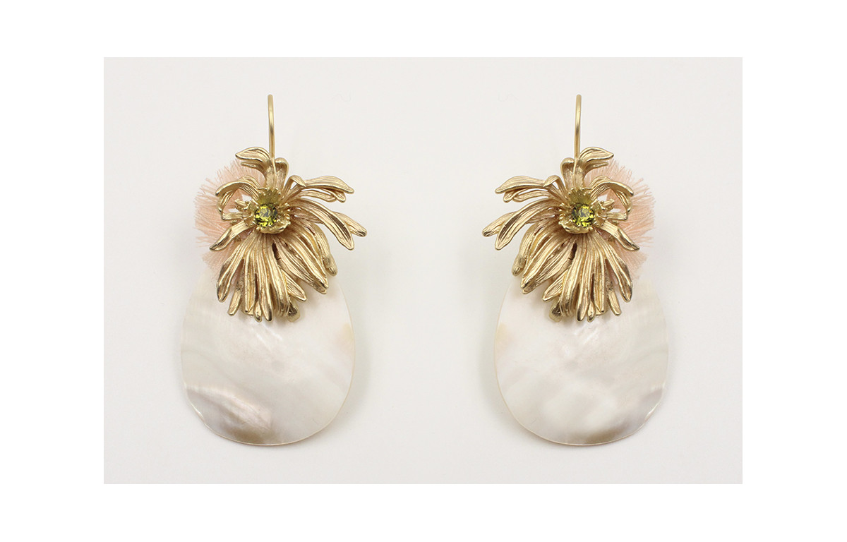 Pendientes con gots de nacar, nenufar en oro mate, brillo verde y multipompón rosa palo. Largo 7cm.