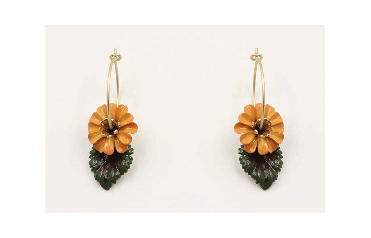 Pendientes aro oro mate con flor esmalte roja y verde colgante hoja esmalte verde