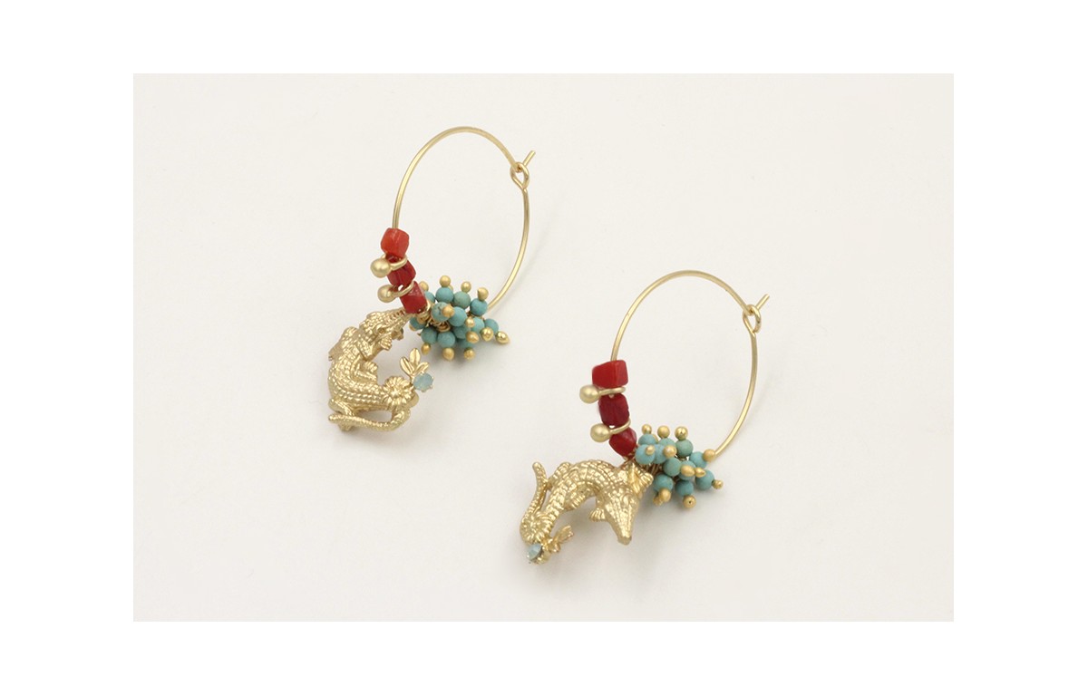 Pendientes aro dorado mate con cocodrilo, burruño bolas turquesas, bolita dorada mate y tonel coral. Largo 4cm.