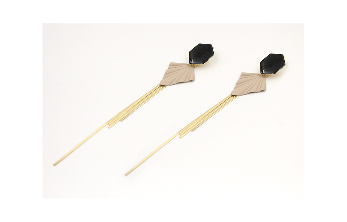 Pendinetes perno hexágono esmaltado negro, triangulo esmaltado visón con tuerca de fleco en oro mate. Largo pendiente 6cm, largo tuerca 17cm.