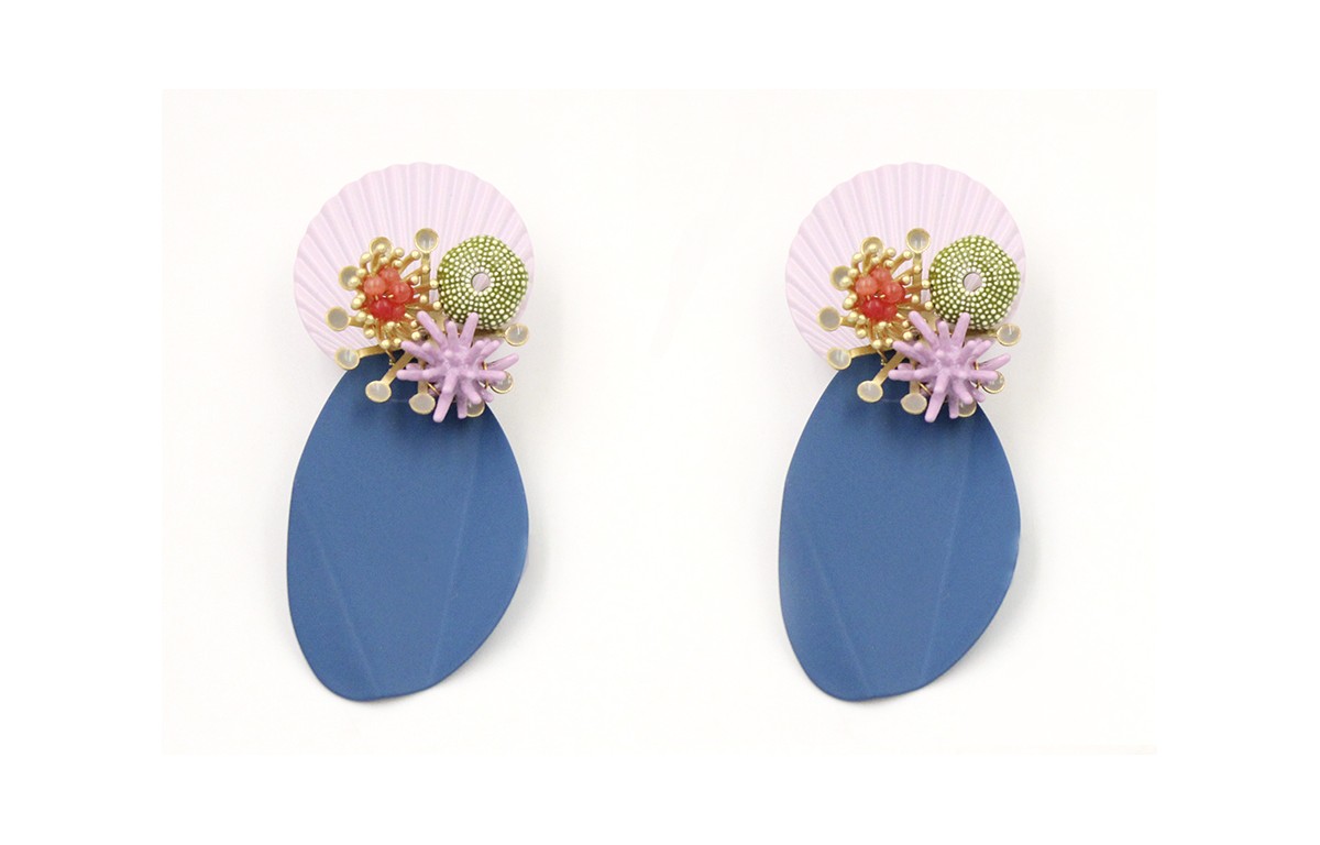 Pendientes perno ondulado lila con colgante azul y rosetón con caracol verde,estrella coral lila y casquilla con estambres y flor semipreciosas rojas. Largo 6cm.