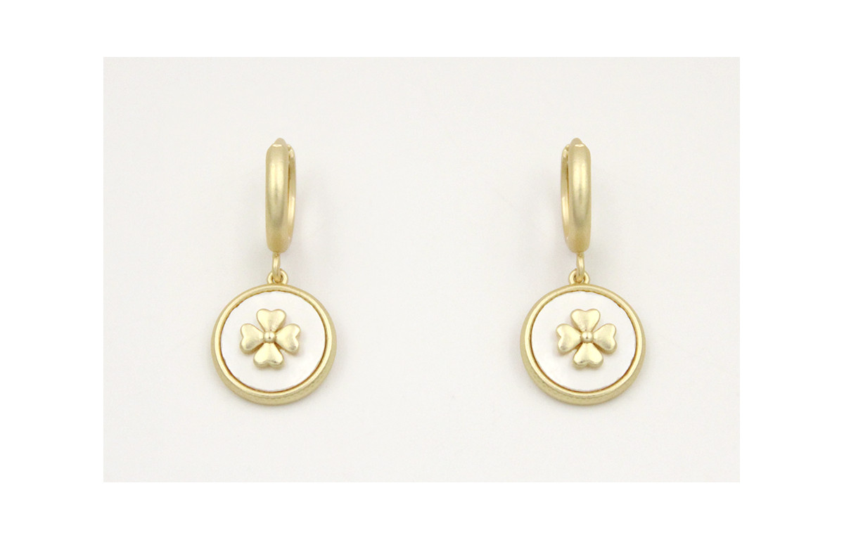 Pendientes cierre aro seguridad con disco nacar engarzado flor. Largo 2,5cm.