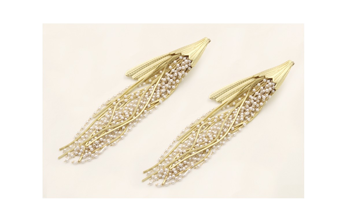 Pendientes perno pluma dorada mate con flecos de cadena de perlas y flecos dorados mate. Largo 13cm.