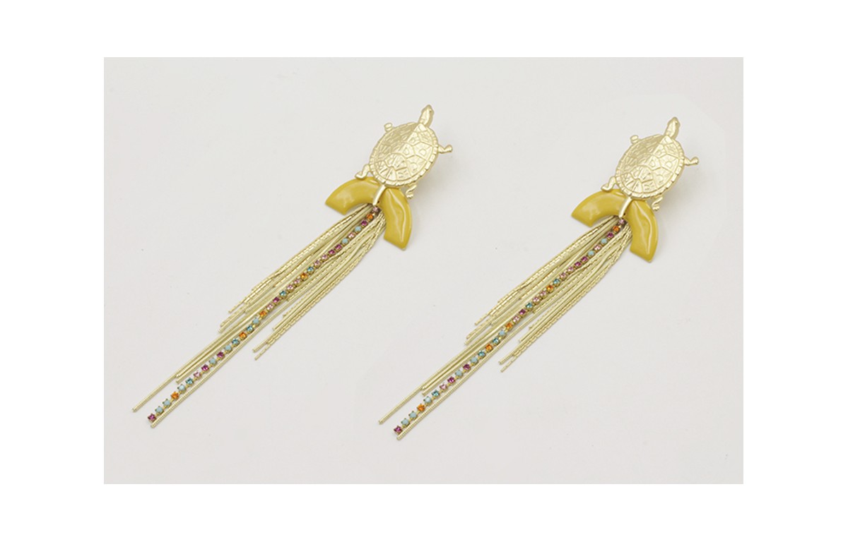 Pendientes perno tortuga dorada mete con semicirculo esmlatado amarillo, fleco dorados mate y cadena de strass de colores rosa,nranja,azul,lila. Largos 13,5cm.