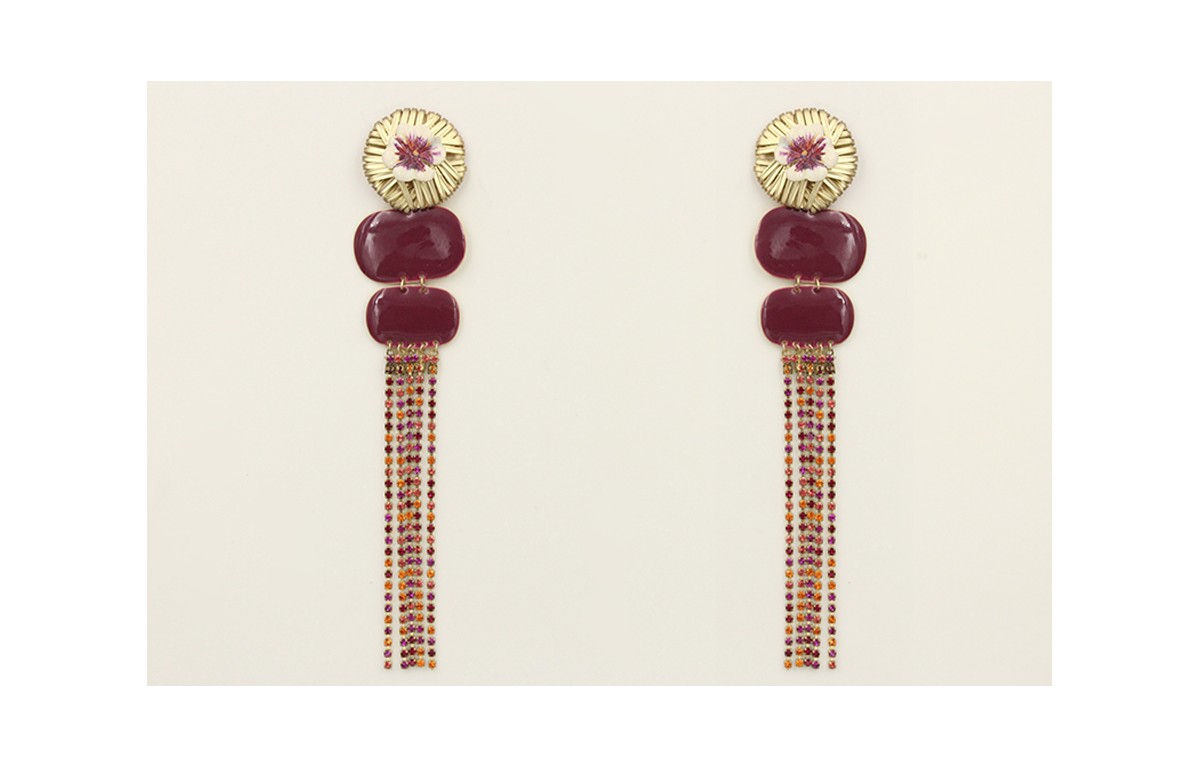 Pendientes perno disco tiras dorado mate con flor blanca,morada y naranja colgante rectangulos ovalados burdeos y flecos cadena de strass naranja,rosa,morada. Largo 14cm.