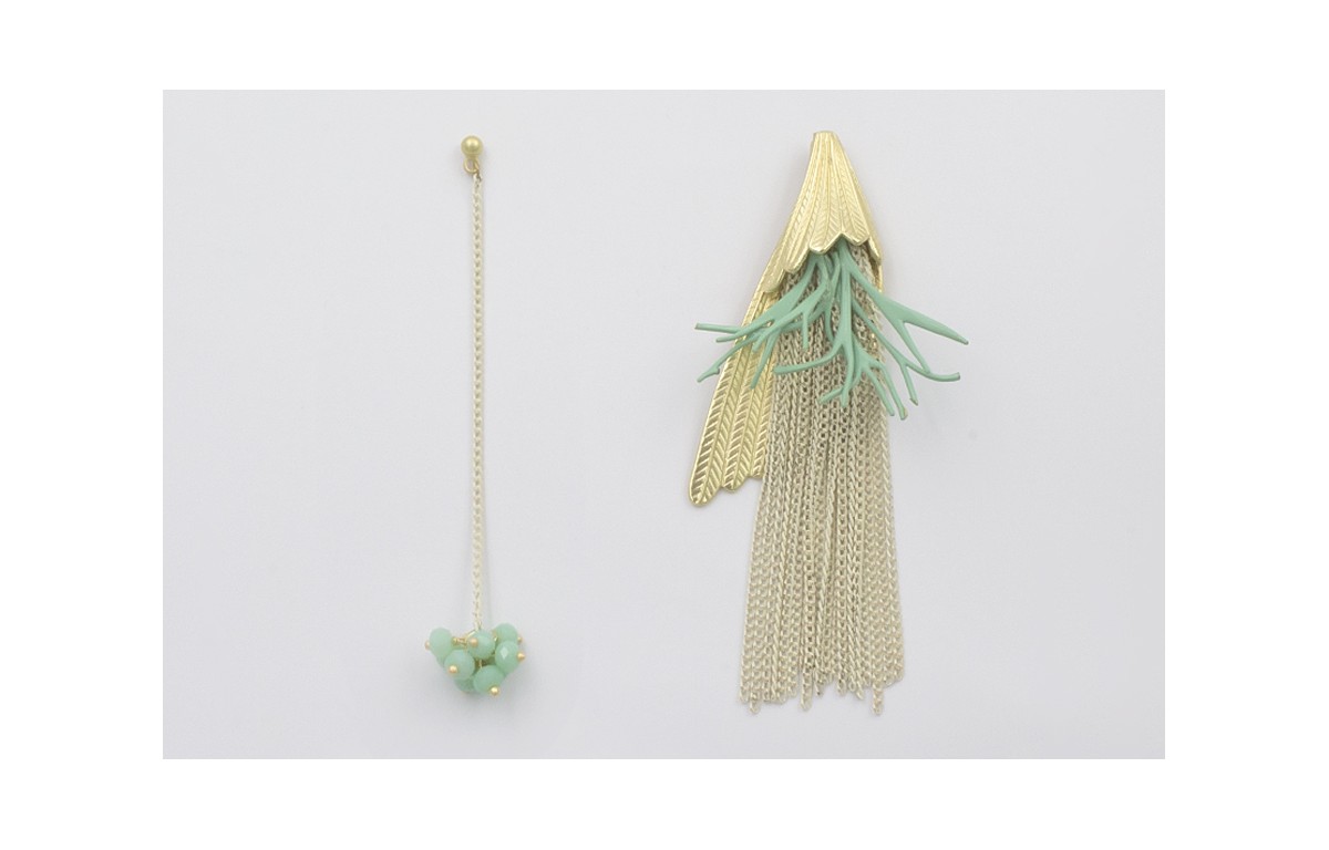 Pendientes asimetricos perno pluma dorado mate con fleco de cadena de eslabón plano beige y rama de coral esmaltada truquesa, perno bolita dorada mate con cadena y burruño facetadas azules.