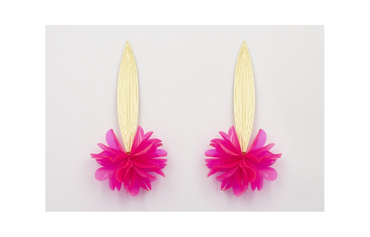 Pendientes hoja alargada dorada mate con flor lentejuelas ovaladas fucsia. Largo 9cm.