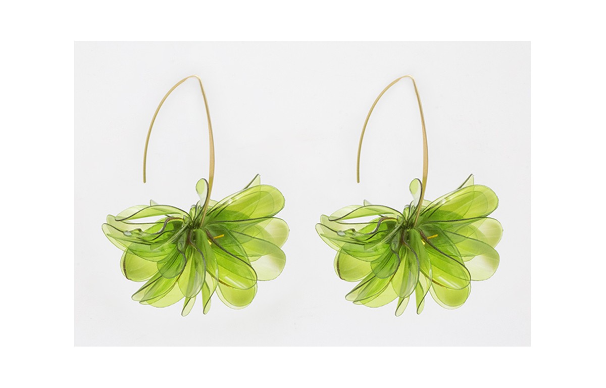 Pendientes V dorado mate con flor lentejuelas ovaladas verdes. Largo 6cm.