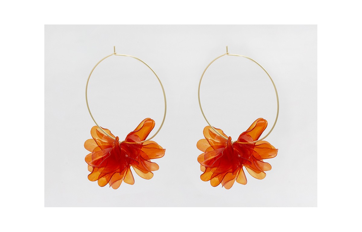 Pendientes aro grande dorado mate con flor lentejuelas ovaladas naranjas. Largo 7cm.