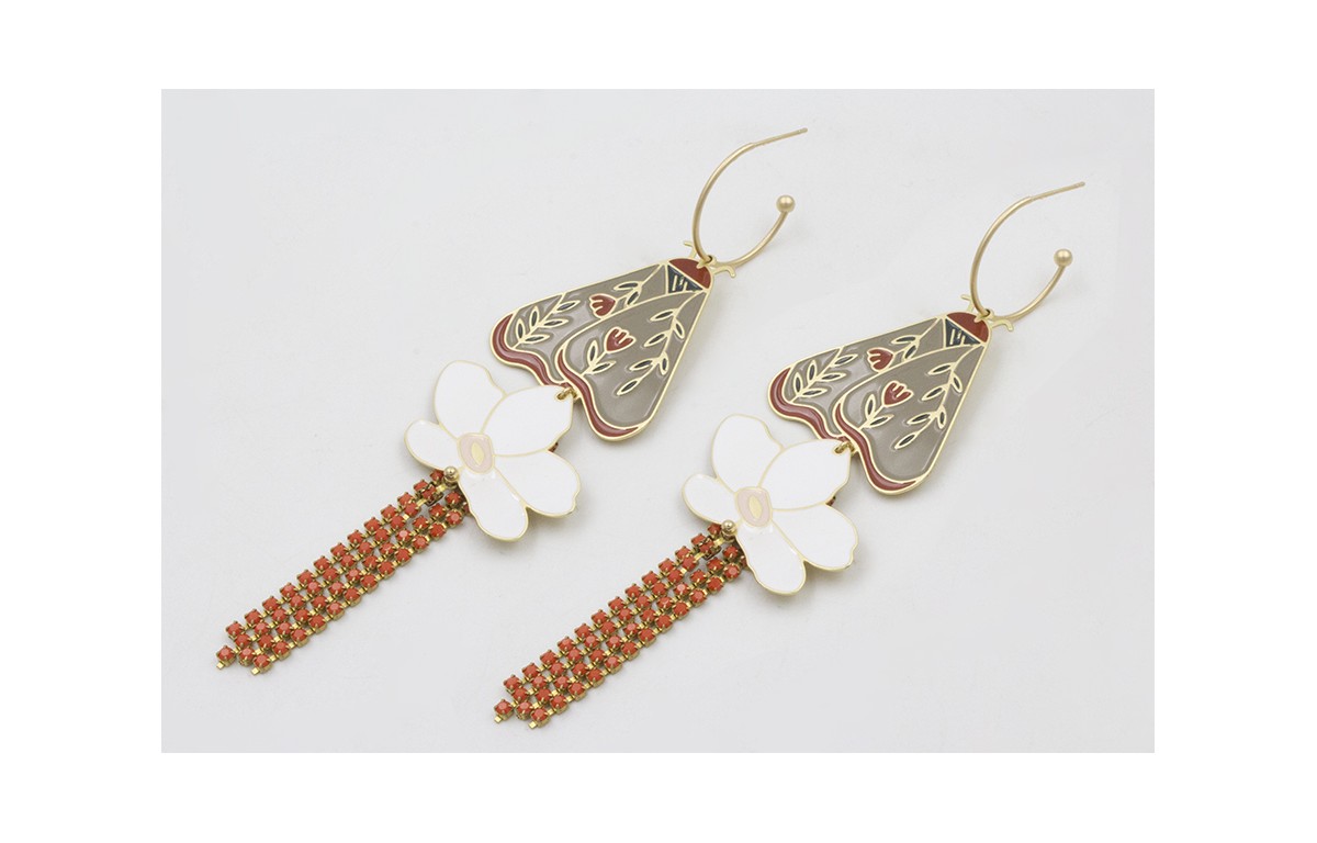 Pendientes aro con bolita dorado mate colgante polilla plana esmaltada gris y tierra con flor plana esmalte blanco y mostaza. Largo 12cm.