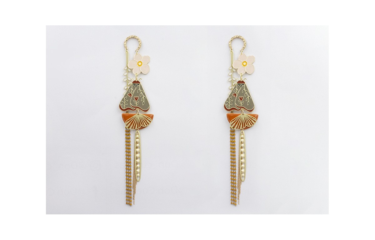 Pendientes perno herradura con flores esmaltadas rosa y mostaza, polilla plana gris y tierra, rama de algodón plana blanca, semicirculo cardera y ala de mariposa, fleco de cadenas. Largo 17cm.
