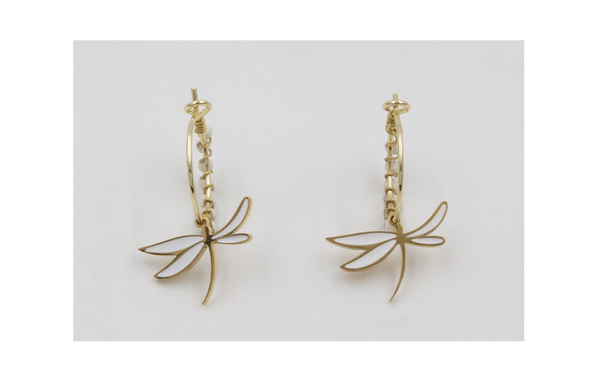 Pendientes acero inoxidable aro con libelula esmalta blanca y bolitas blancas cosidas. Largo 3cm.
