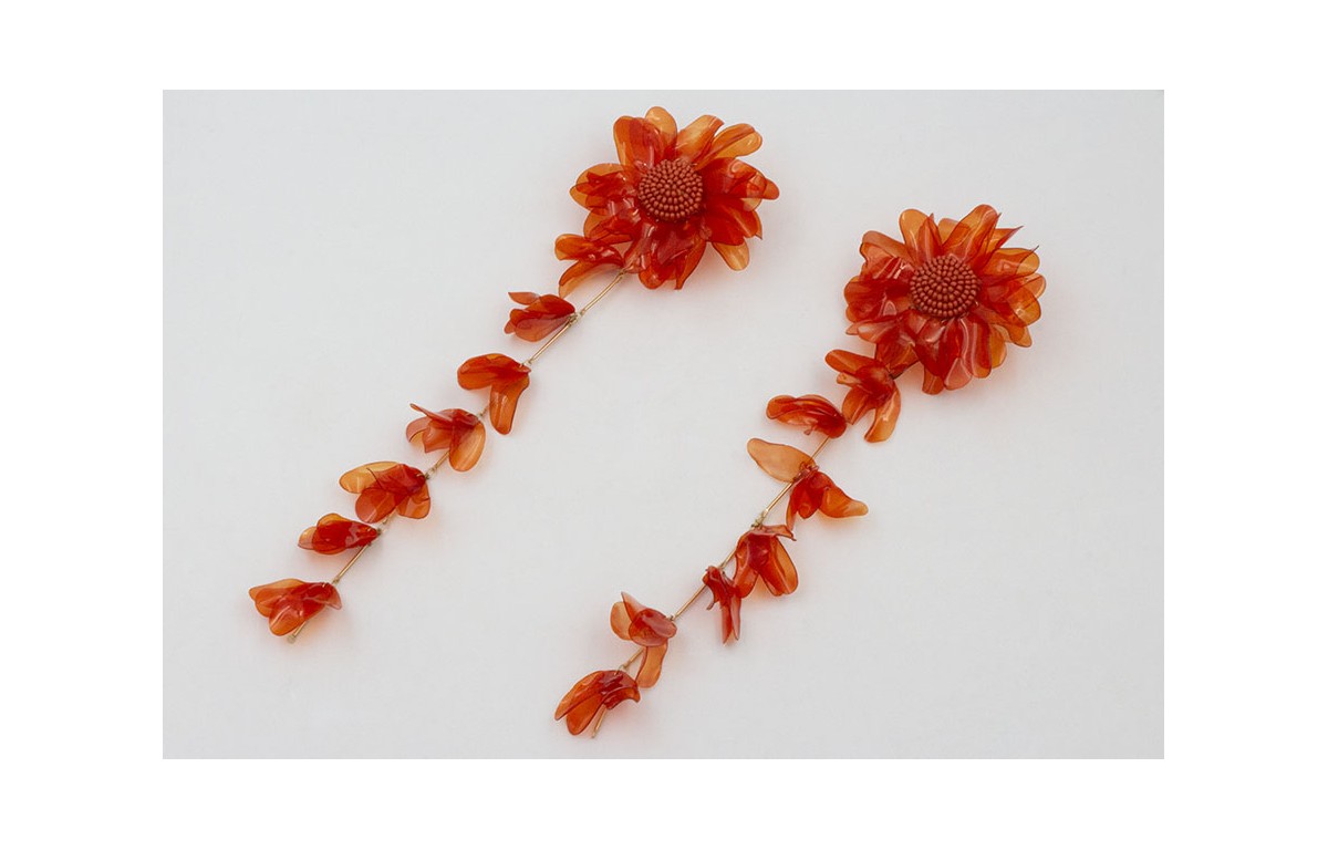 Pendientes extra largos flores de lesntejuelas ovalado naranja y fleco con burruños. Largo 17cm.