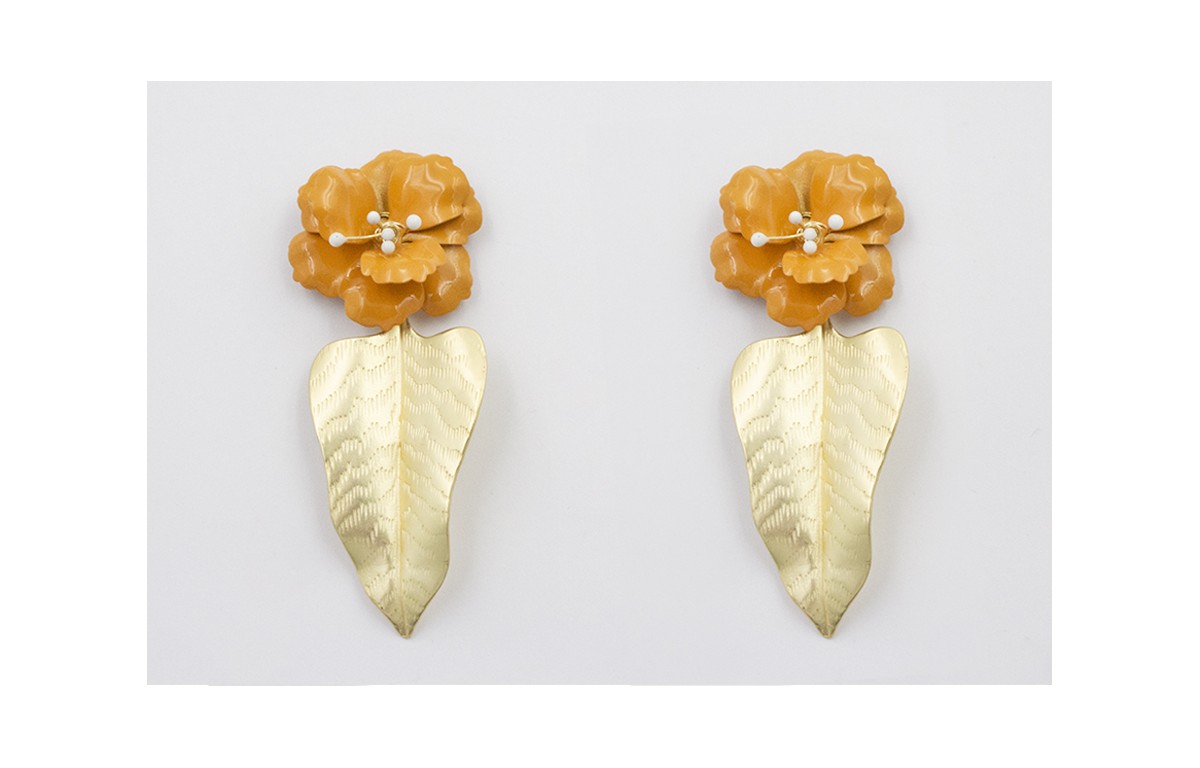 Pendientes hoja dorada mate con flores sobrepuestas esmaltadas arcilla y pistilos blancos. Largo 8cm.