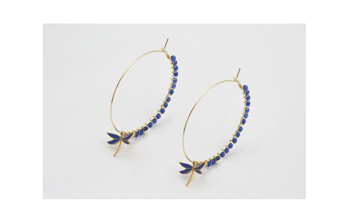 Pendientes acero inoxidable aro grande con libelula esmaltada azulona y bolitas cosidas azulonas.