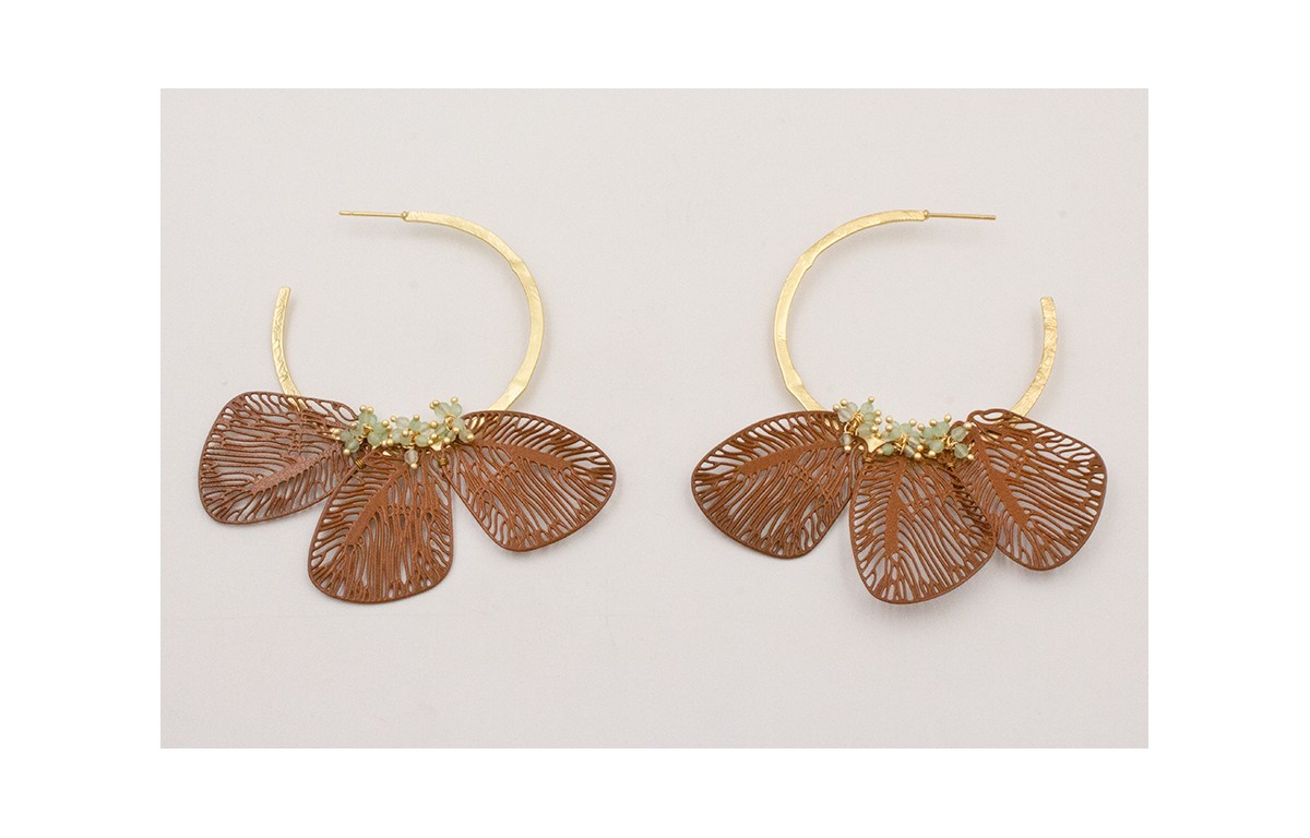 Pendientes aro plano dorado mate con alas redondeadasmariposa esmalte marrón burruño bolitas verdes.
