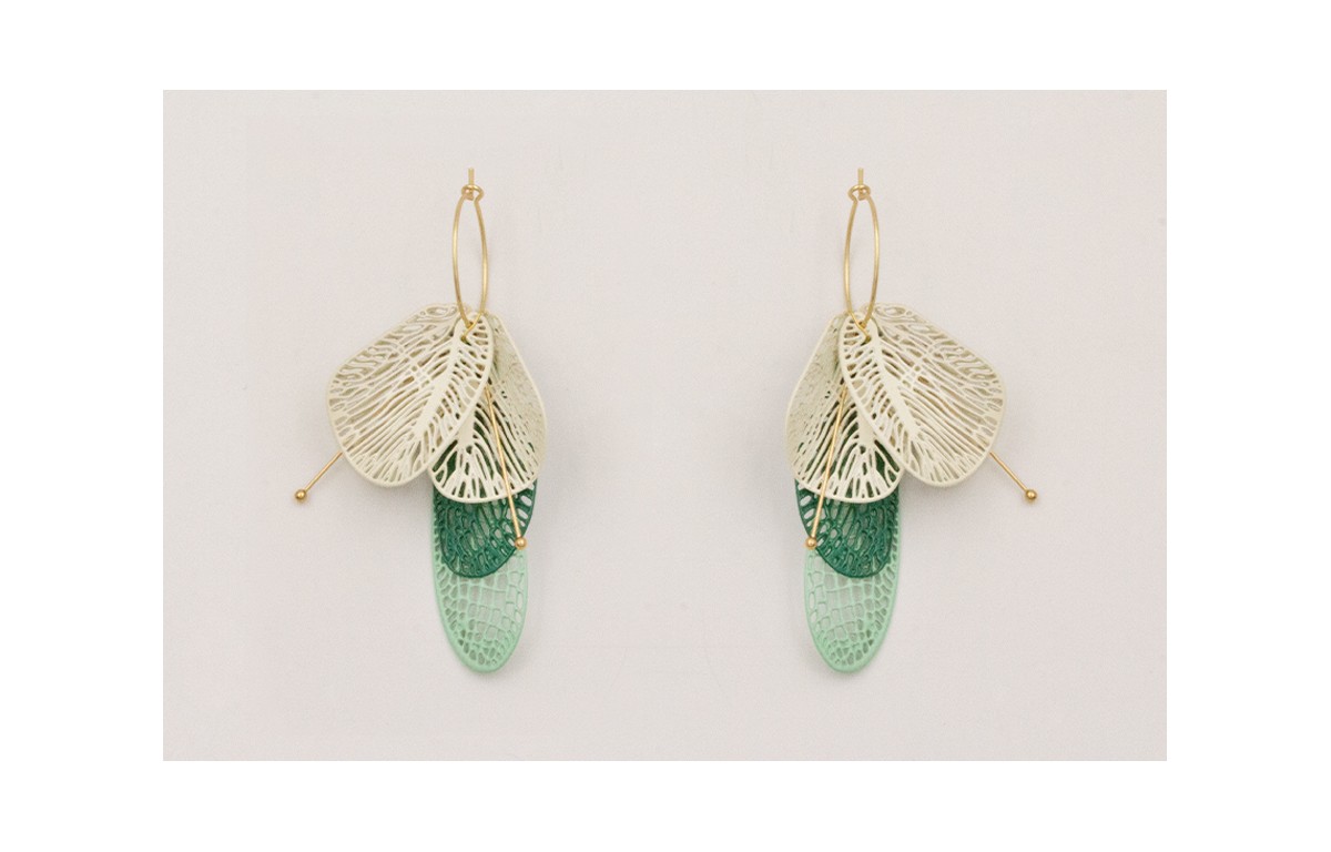 Pendientes aro mediano dorado mate con colgante alas redondeadas esmalte blanco yh alas libélulas esmalte turquesa y verde.
