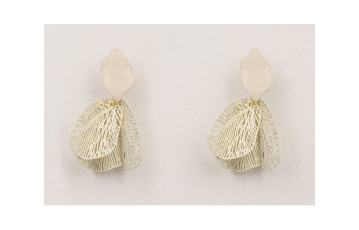 Pendientes pétalo color beige con colgante alas redondeadas mariposa esmalte blanco.