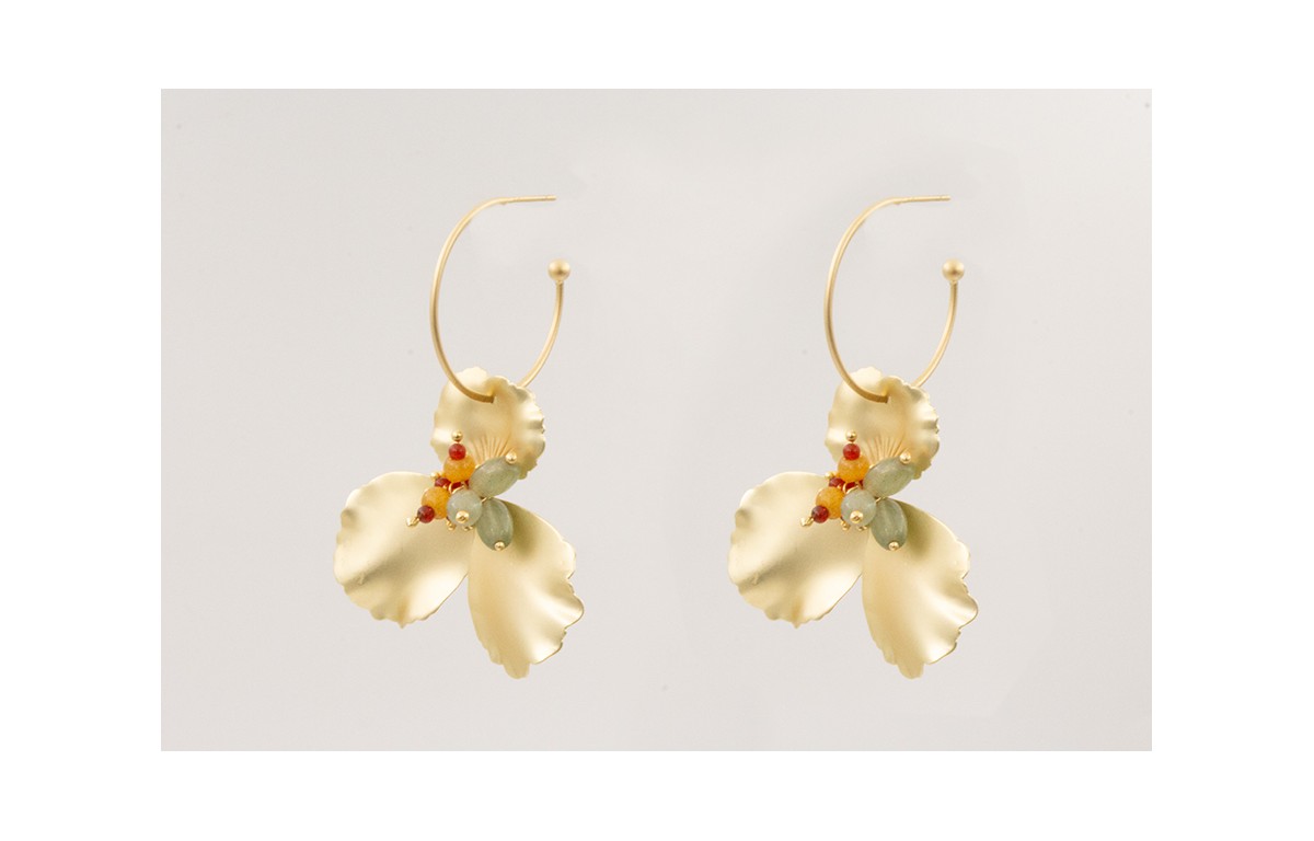 Pendientes aro bolita dorado mate con colgante flor 3 pétalos.