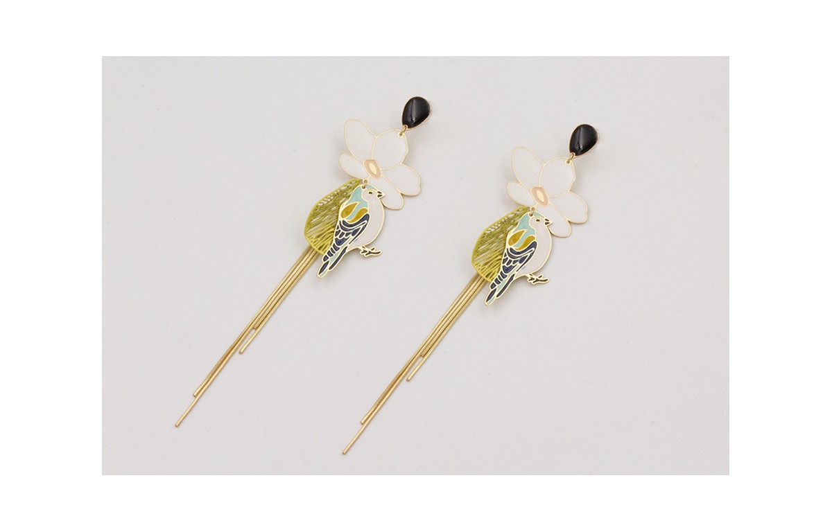 Pendientes perno gota esmaltada negra con flor plana esmaltada blanca, pajaros esmaltado turquesa, ala rendondeada mariposa mostaza y fleco cadena doarada mate.