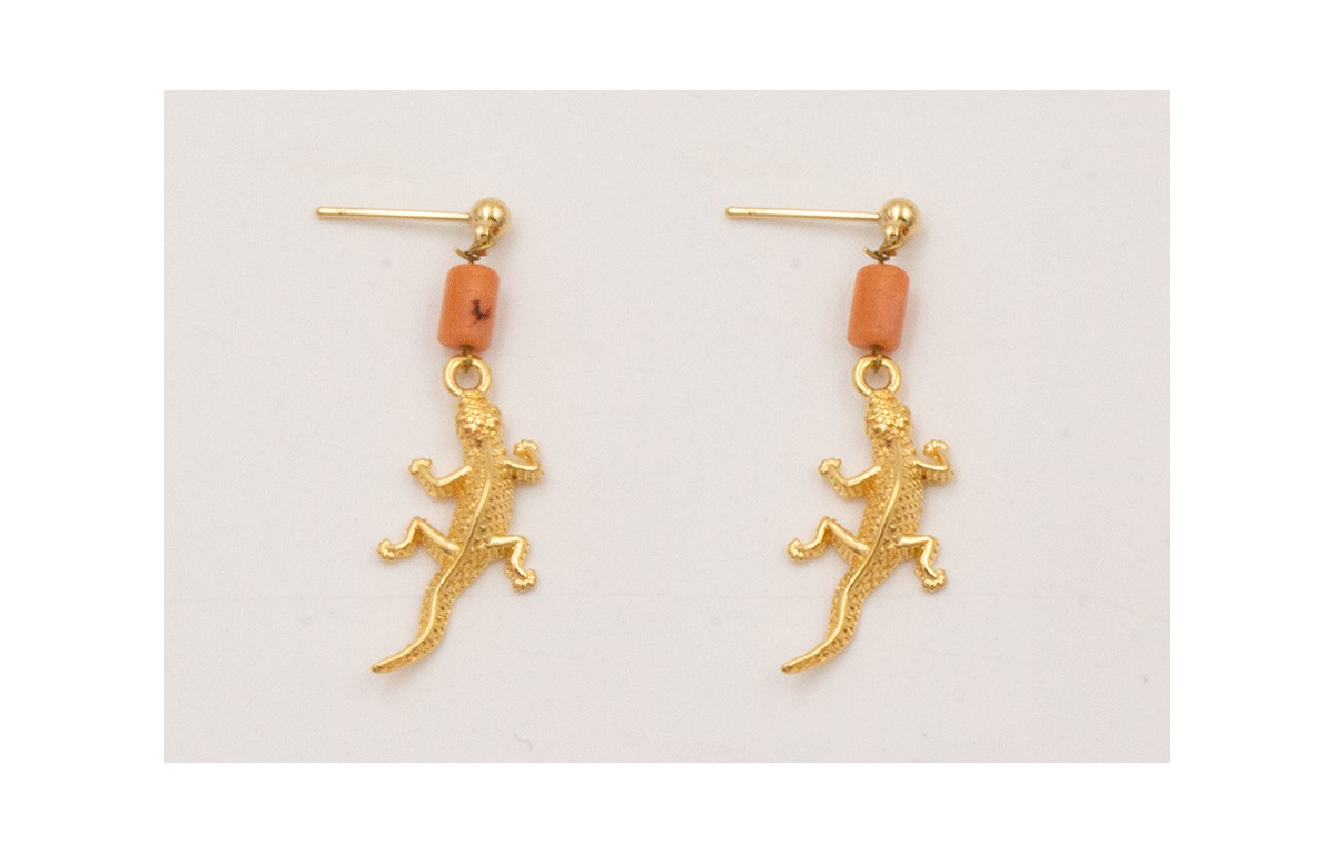 Pendientes ORO-18K-3MICRAS perno bolita colgante lagarto y tubo coral.