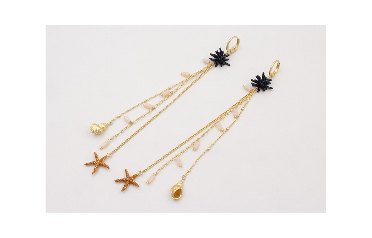 Pendientes de gancho con estrella coral azul oscuro,cadena triple con caracola,estrella de mar marron y rectangulos beige