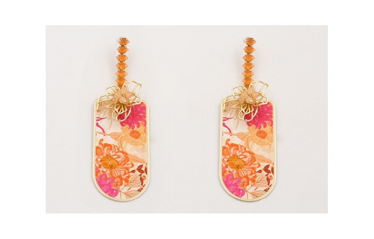 Pendientes cadena strass cristal naranja con colgante pieza flores rosas y blancas con flores de alambre dorado mate con burruño bolitas rosas.