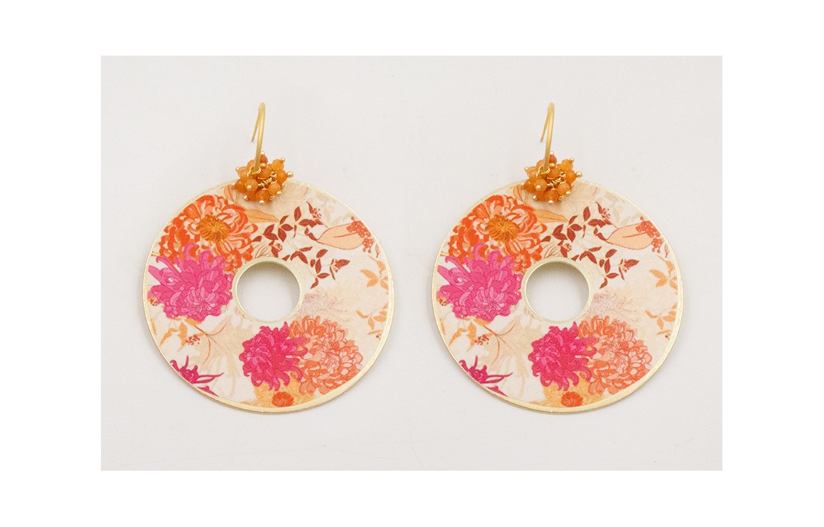 Pendientes gancho bolita dorado mate con colgante disco flores rosas y blancas con burruño bolitas naranjas.
