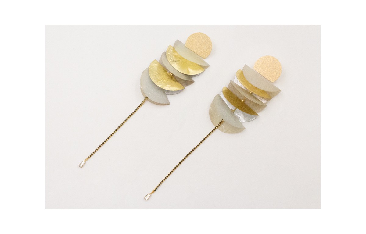 Pendientes perno semi disco rugoso con lentejuelas disco dobladas a la mitas rematadas con fleco cadena de strass negras y cabujón cristal cónoco.