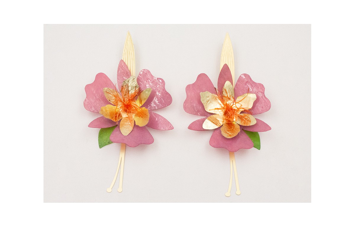 Pendientes perno hoja alargada dorada mate con flor grande morada, flor dorada de lentejuela, hoja verde lentejuela, colgante 2 pendulos dorado mate.