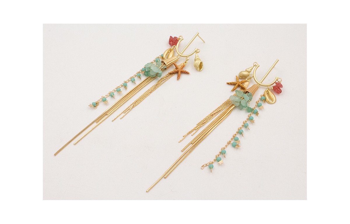 Pendientes perno ancla dorada mate con colgantes caracolas, conchas,estrella esmaltad amarrón, rama chip jade y varios flecos.