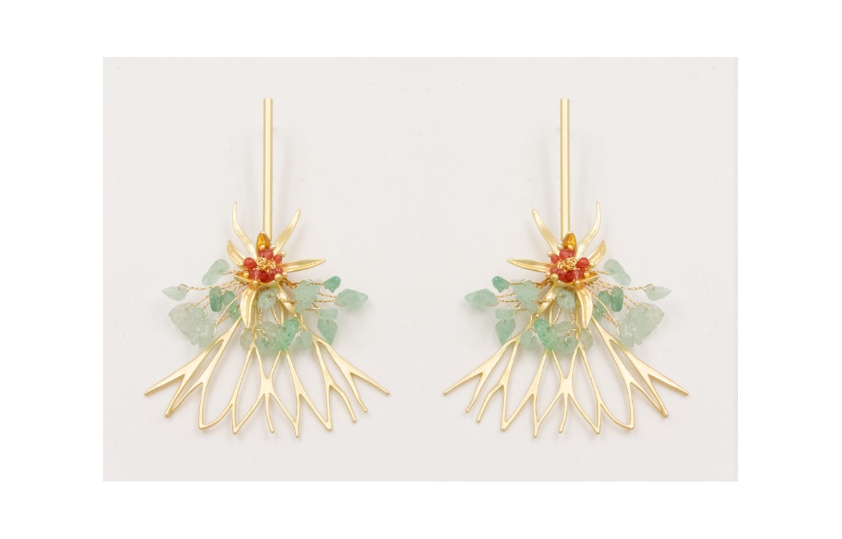 Pendientes pivote dorado mate con rama coral dorada mate con rama chip jade, flor pétalos desiguales con burruño bolitas rojas.