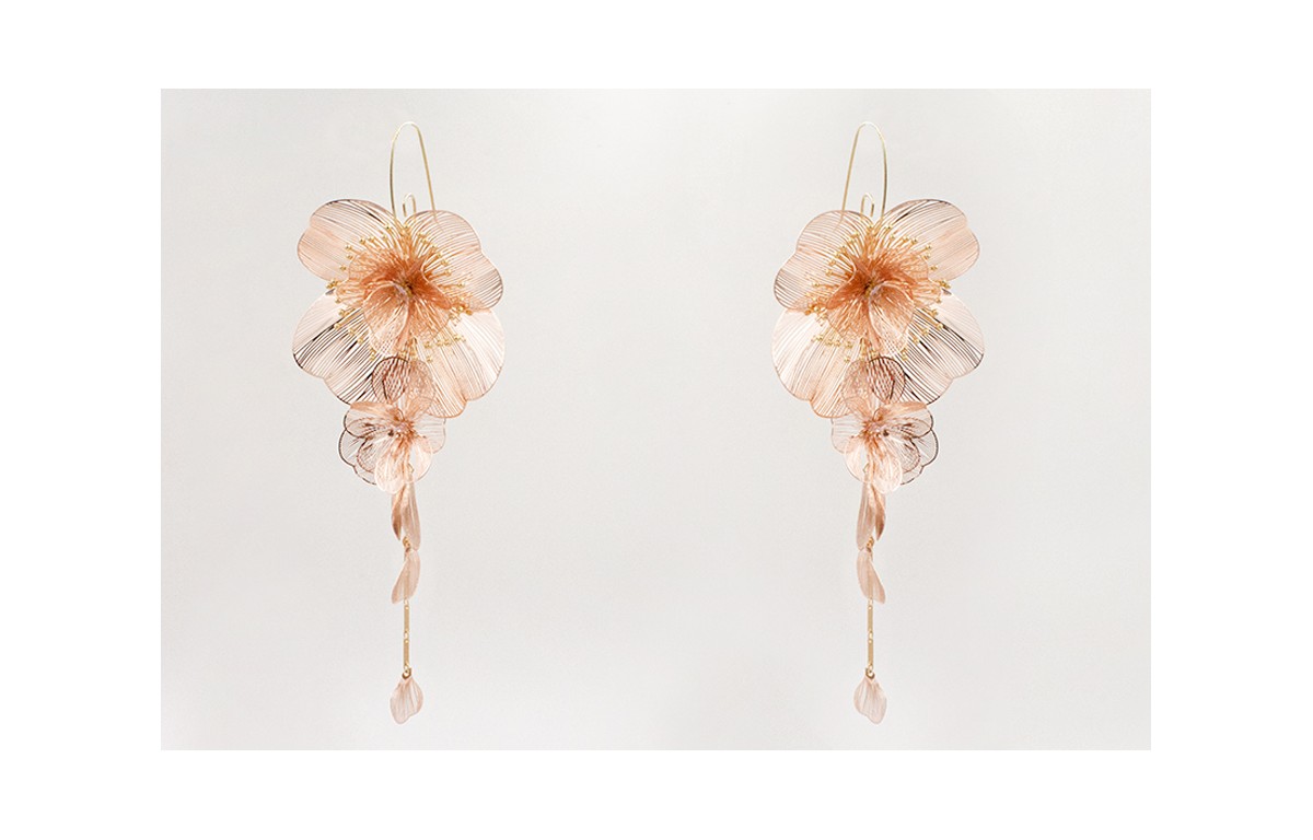 Pendientes gancho dorado con flores metalicas color cobre en cascada.