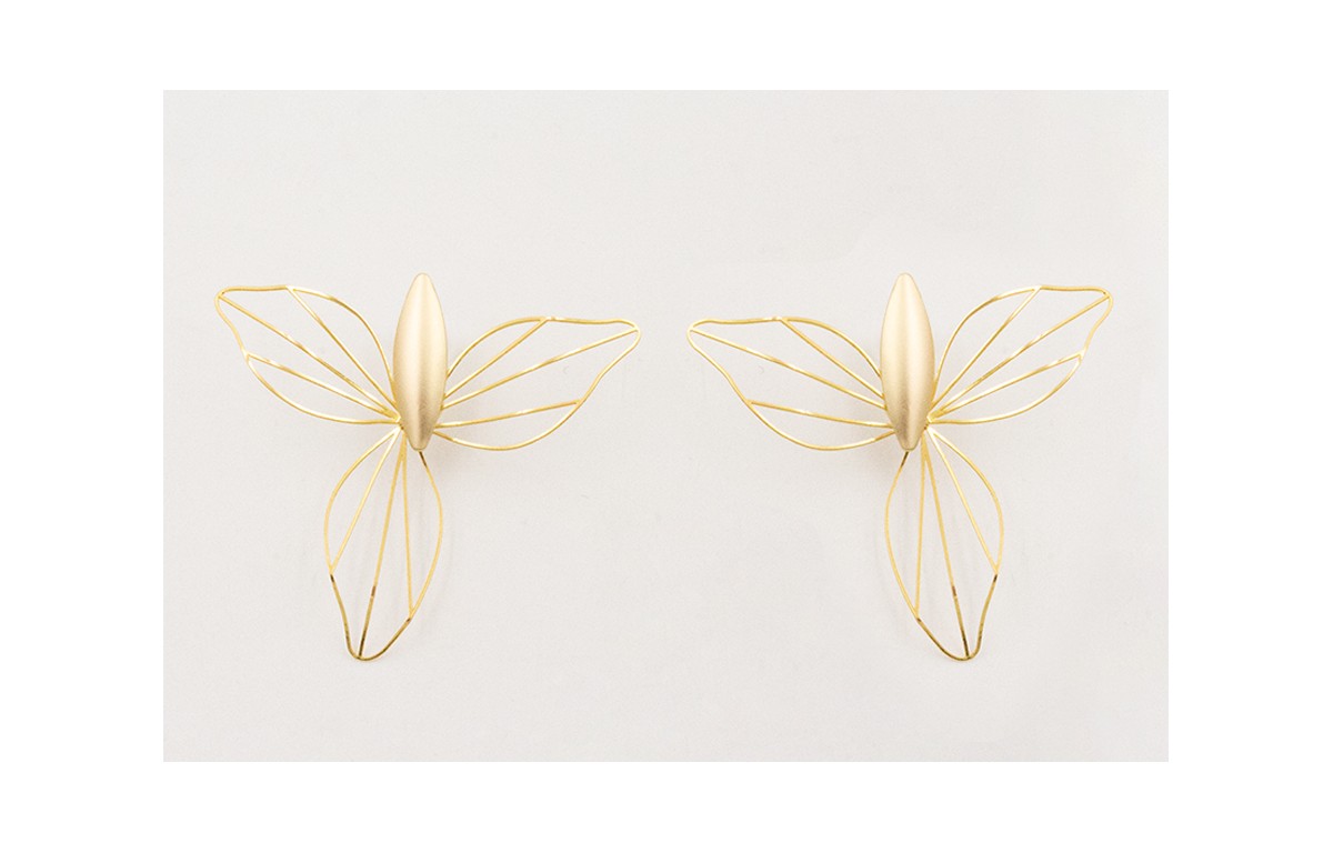 Pendientes perno ovalado concavo con flor 3 pétalos dorada.