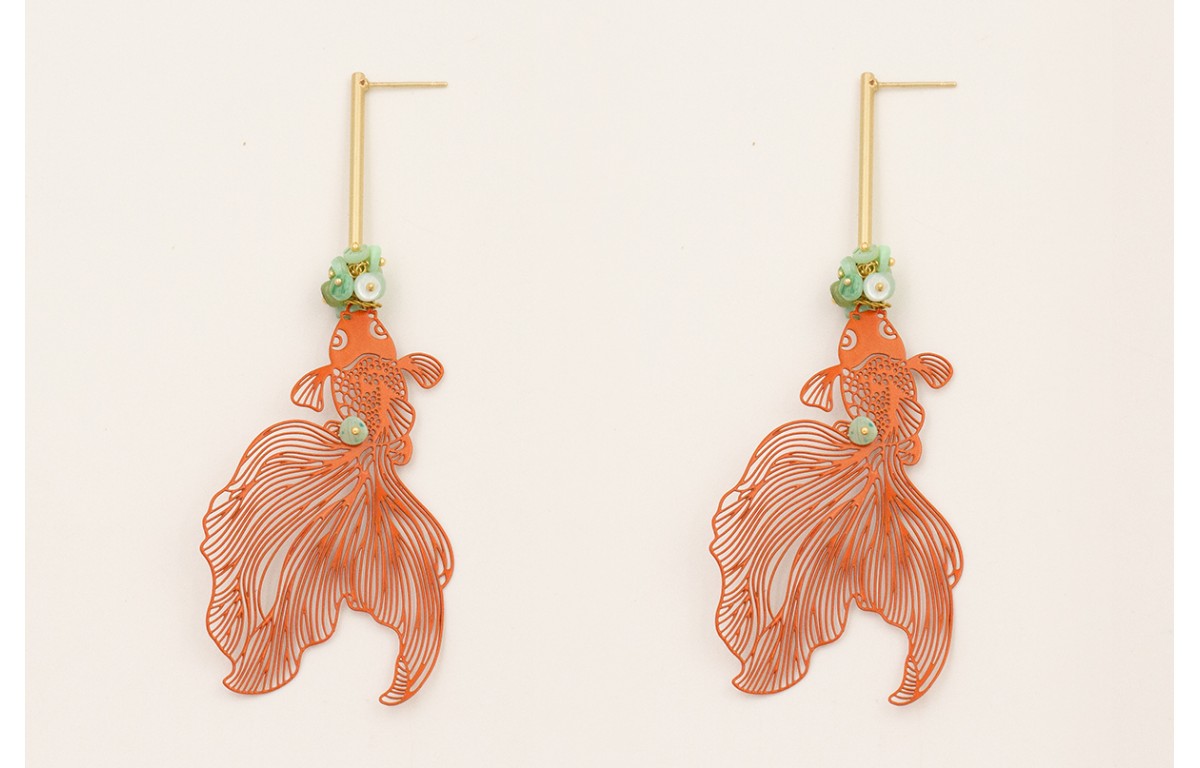 Pendientes perno pivote dorado mate con pez tropical esmaltado naranja y burruño de discos coral color tuequesa.