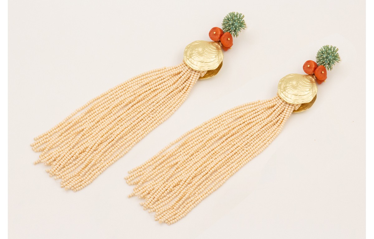 Pendientes perno nenufar esmaltado menta,discos coral,conchas doradas mate y fleco de abalorio crema.