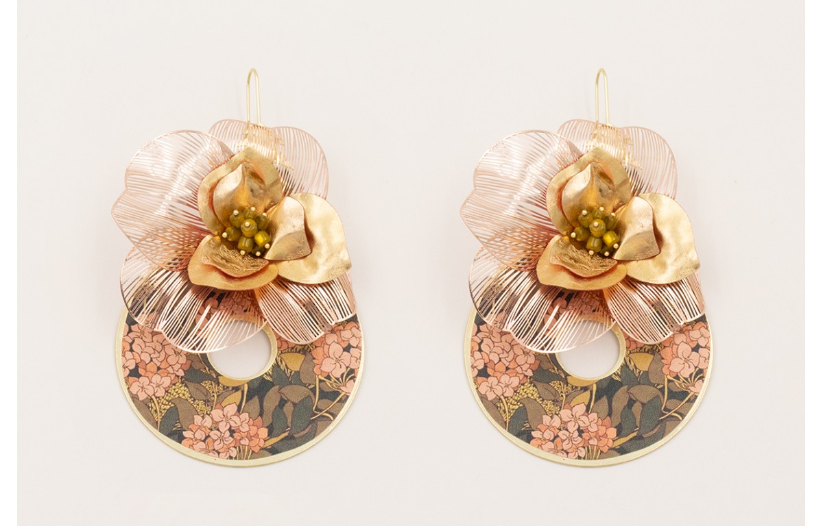 Pendientes disco estampada flores rosas y ramas con flor alambre dorada rosa, flor lentejuela dorada y rosa y burruño cubo nacar marrón verdoso.