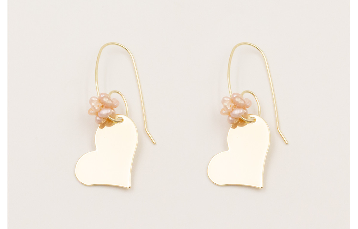 Pendientes gancho dorado con bola de perlas tostadas y colgante corazón dorado.