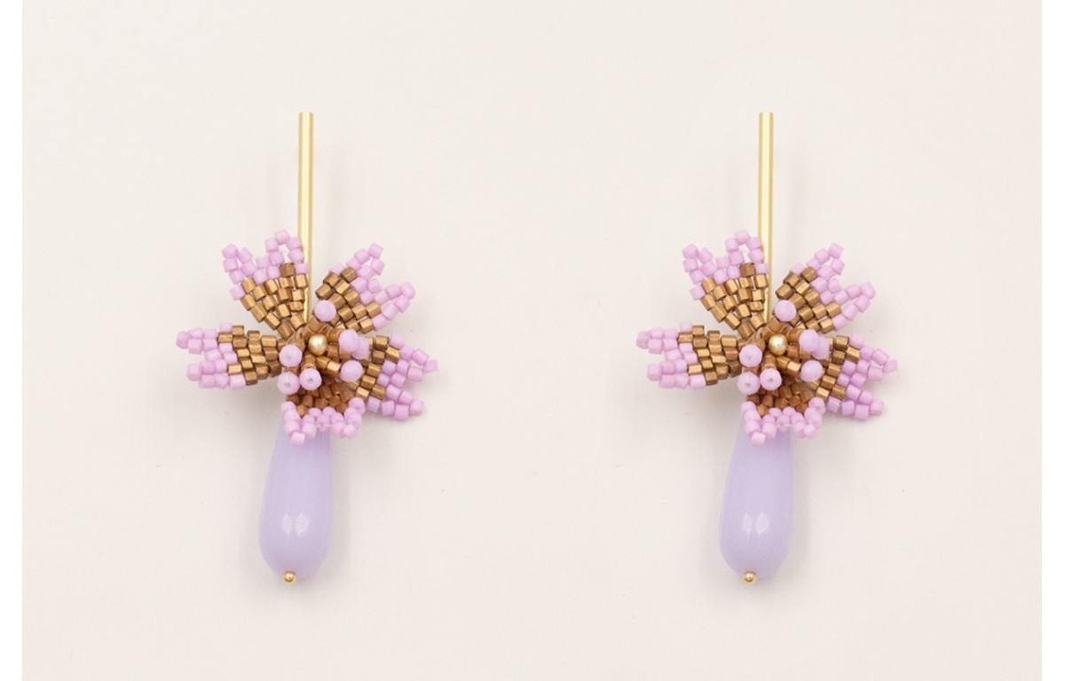 Pendientes perno pivote dorado mate con flor miyuki lila y cobre y colgante gota facetada lila.